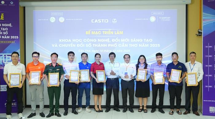 Lãnh đạo Sở KH&&CN và CTU trao GCN cho đại diện các đơn vị tham gia trưng bày